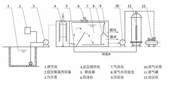 加压溶气气浮在国内外应用广泛,该法师将原水加压至0.3~0.4MPA,同时通入空气,使空气溶解与水中并达到相应压力状态下的饱和值,然后骤然减至常压,溶解于水中的空气以微小气泡的形式从水中释放出来,气泡直径约为Ø20~Ø100μm左右,目前的基本流程有全部进水加压溶气气浮、部分进水加压溶气气浮、部分处理水回流加压溶气气浮等三种,都是由加压泵、溶气罐、释放器和气浮池等基本设备组成。
